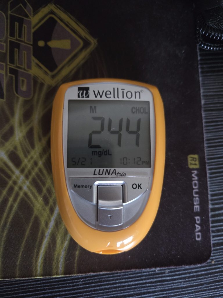 El colesterol en mi caso es de 244 y esta para hacer o 40 km en bicicleta y 5 km corriendo o 30 km andando sin comer nada, para que se ponga en valores normales, pero tengo que ver cómo está el día mañana y al con los valores normales podría ir más rápido al sobrepasar eses Kilómetros.