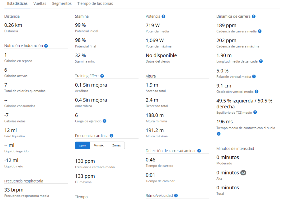 Podría ser más pero no consigo estar en contacto con el suelo en cada paso y gracias posiblemente al sobrepeso conseguí esta cifra corriendo. El tiempo de contacto con el suelo es de 126ms.