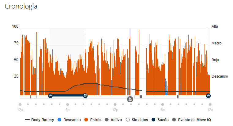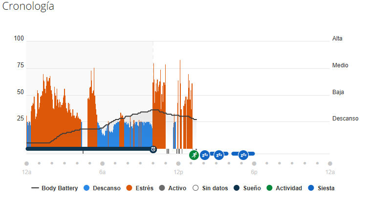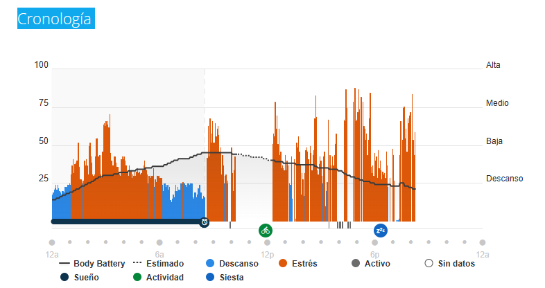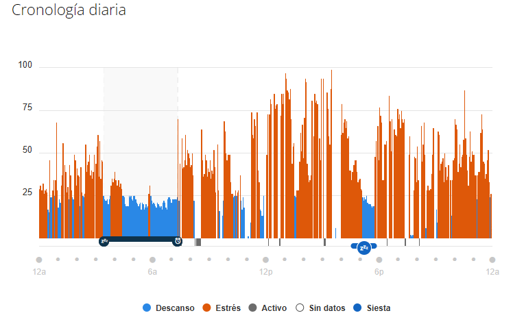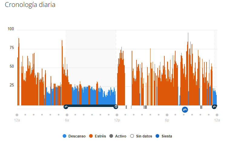Otra cosa que también hay que analizar es el estrés y el sueño. Si mi teoría es cierta de que el indicador de estrés que marca el reloj Garmin es cuando suben y baja el lactato en sangre o anticuerpos en sangre, sin comer nada, por ejemplo, esta imagen de hace dos días se puede ver, el estrés durmiendo y siesta y se puede ver a lo largo del día como cambia y se pone en azul cuando el anticuerpo baja y en naranja cuando el anticuerpo sube. Durmiendo si el anticuerpo sube, es que la sangre esta espesa y con mucho anticuerpo.