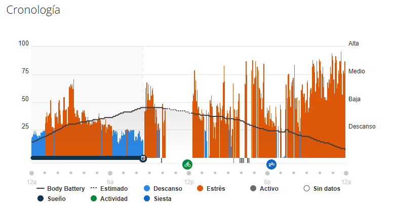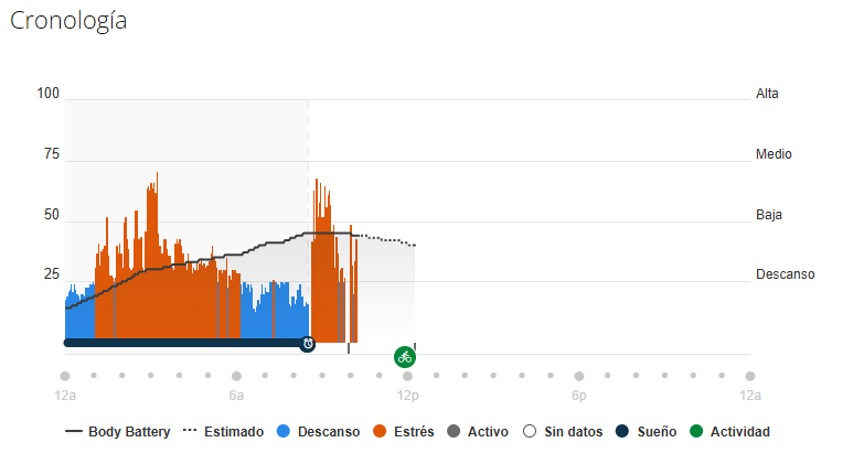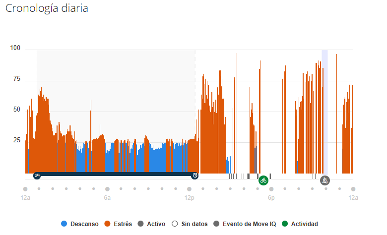 Y este es la cronología de estrés de hoy 08/11/2025, 8 horas de sueño en bicicleta, puse el relog a cargar y el ciclocomputador de la bicicleta, no tienen medidor de estrés no oximetría.