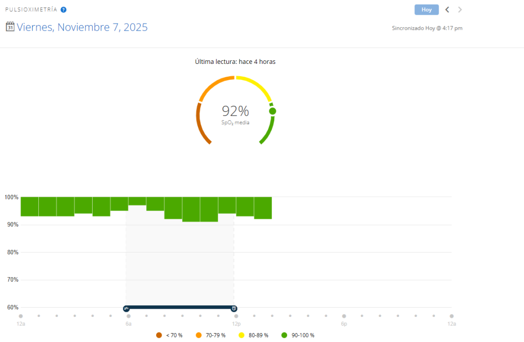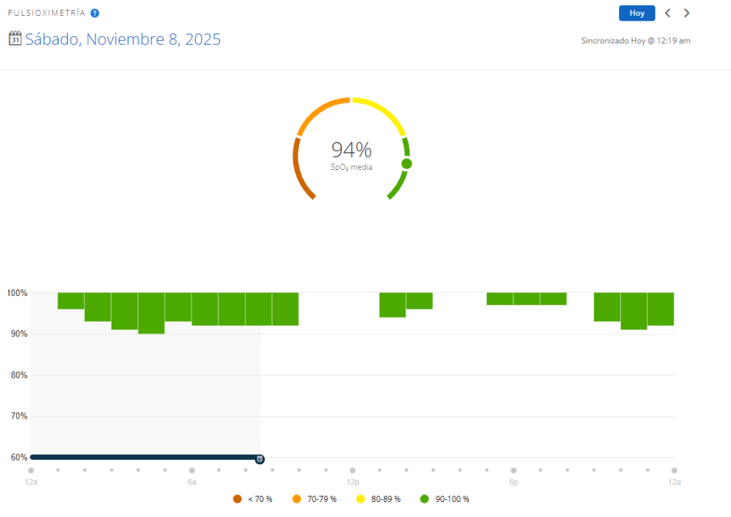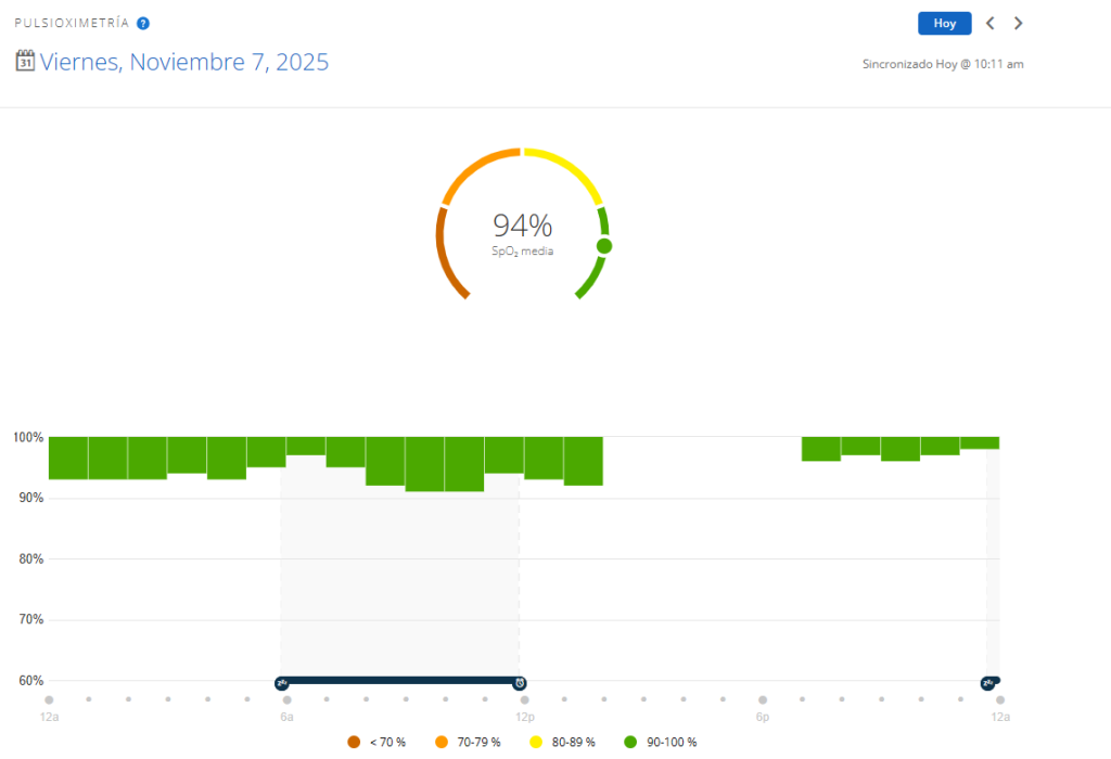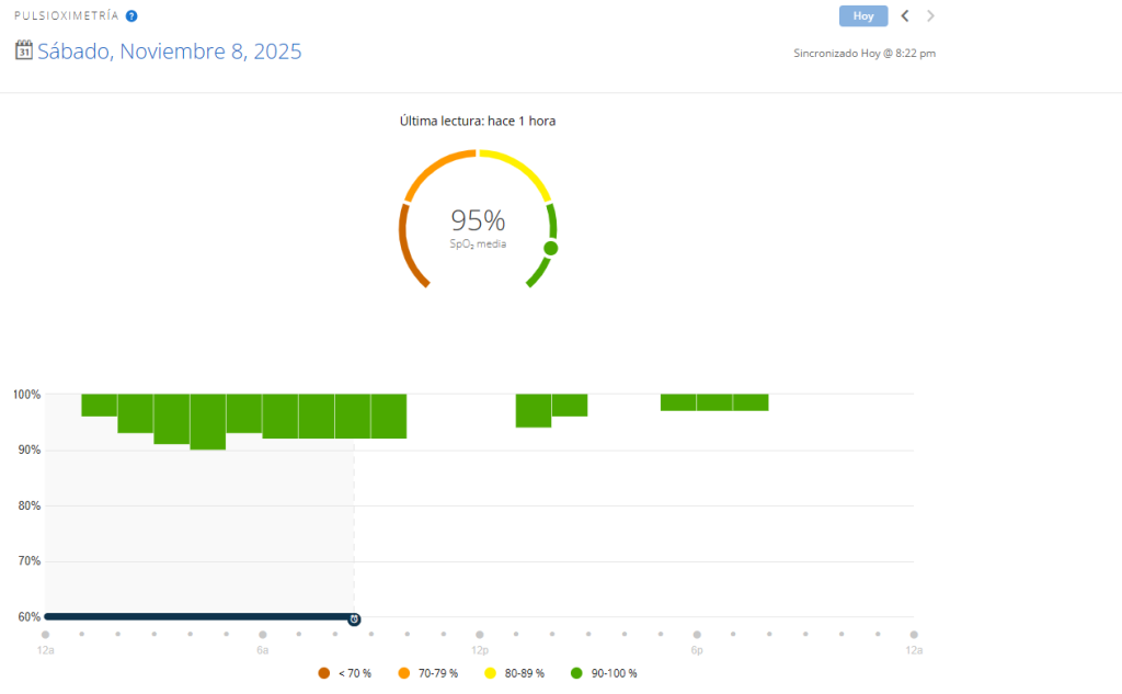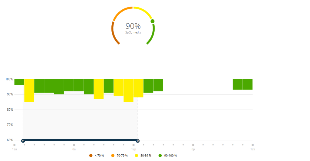 Esta imagen del día de ayer de oximetría indica comparada con la imagen de estrés que al levantarse después del sueño y al hacer ejercicio bajan los niveles de oxígeno en sangre y en blanco es un poco la perdida de precisión del sensor ya que no puedes moverte mucho para que mida el sensor. Tambien hay que analizarlo con las pulsaciones por minuto, ya que al levantarme me suben las pulsaciones y la presión arterial.